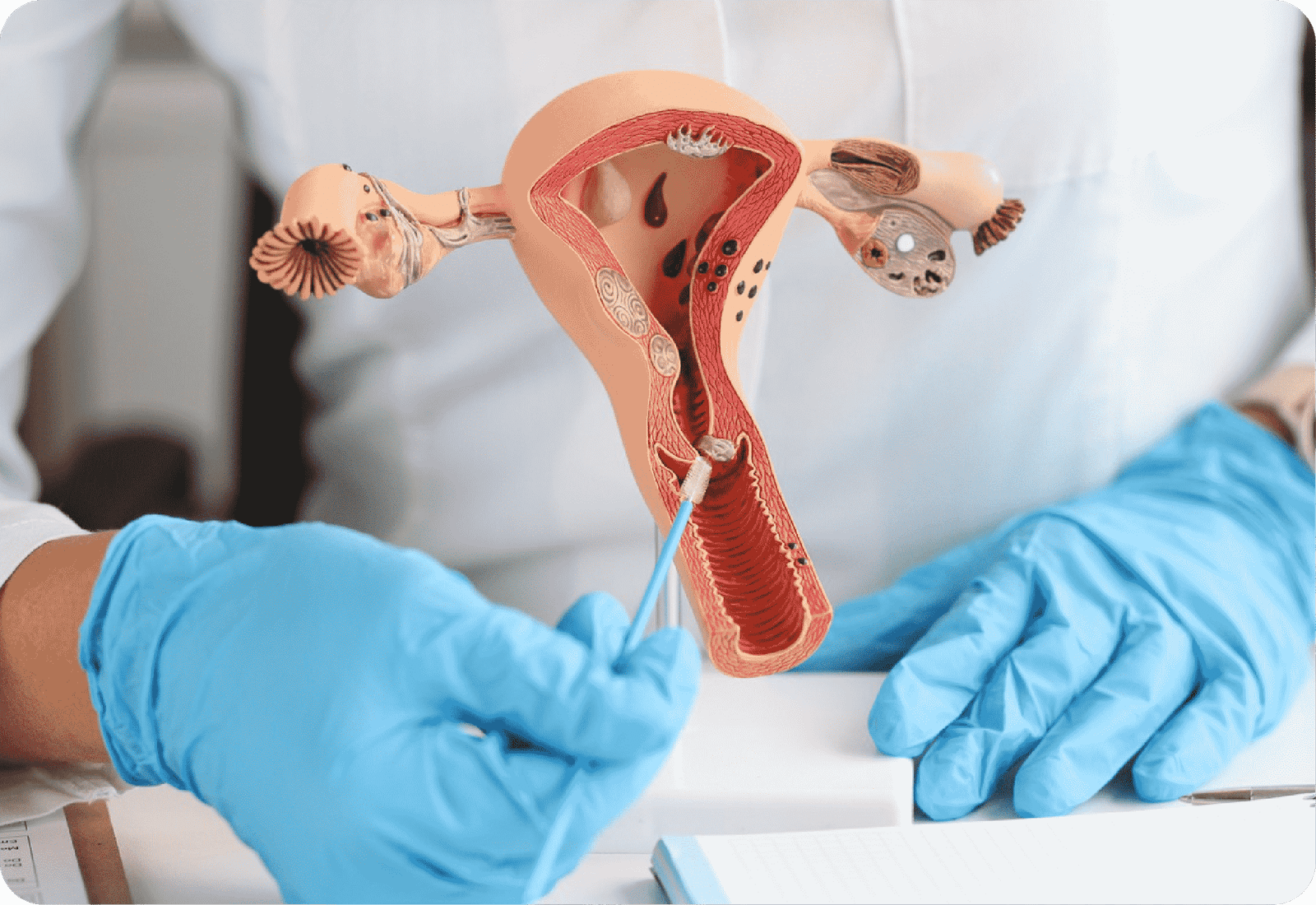Most cervical cancers are caused by a long-term infection with high-risk human papillomavirus (HPV). In the beginning, there may not be any signs, but symptoms can include bleeding from the vagina that is not typical (between periods, after sex, or after menopause), watery or bloody discharge, and pelvic pain during sex. Regular Pap screenings and HPV tests are important for finding problems early, often finding alterations that could lead to cancer before it happens.